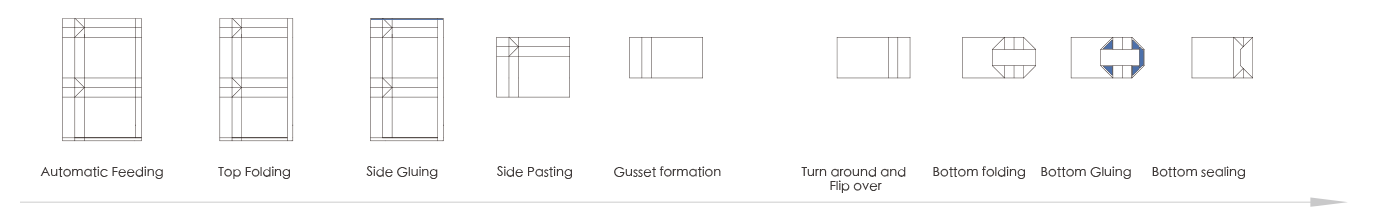 The basic working flow is sheet feeding, positioning, top folding (insert pasting), tube forming, gusset forming, bottom open, bottom gluing, compaction and output.